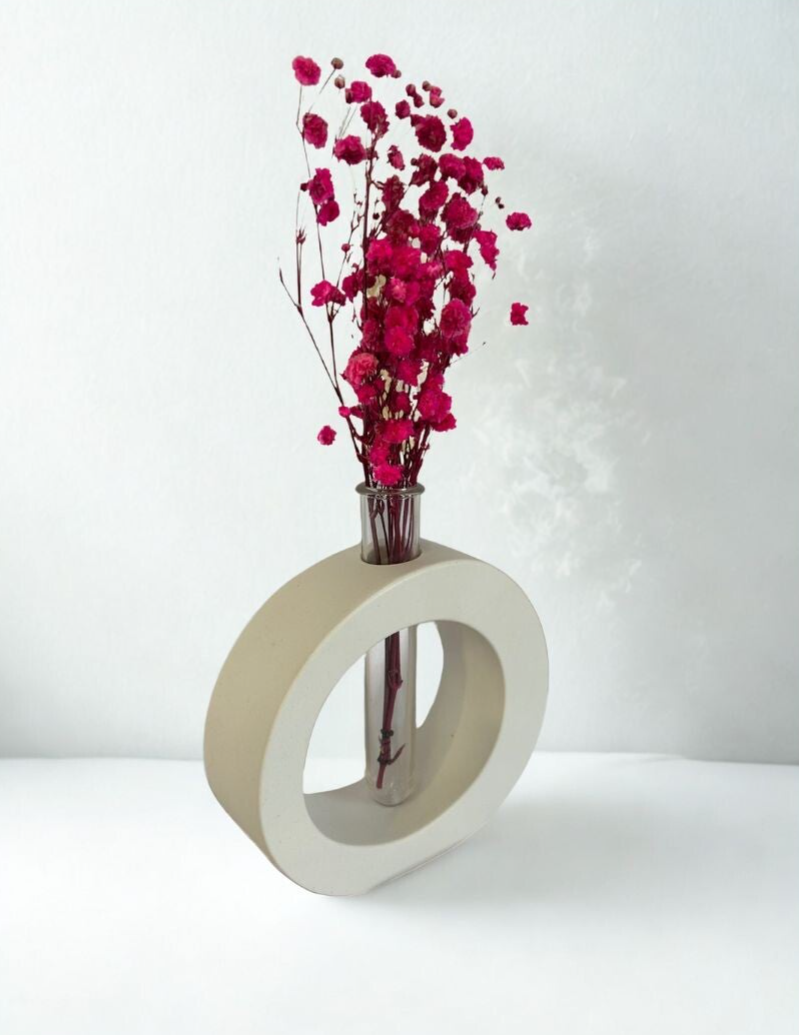 Dieser handgefertigte, ovale Körper aus hochwertigem Raysin ist mit einem eingesetzten Reagenzglas versehen und bietet die perfekte Möglichkeit, Trockenblumen, Gräser oder kleine Schnittblumen dekorativ in Szene zu setzen. Durch seine schlichte Form und die matte Oberfläche fügt sich die Vase harmonisch in jeden Wohnstil ein – ob modern, skandinavisch oder klassisch.
